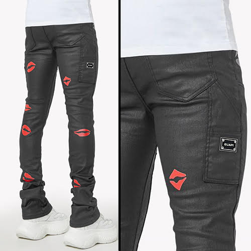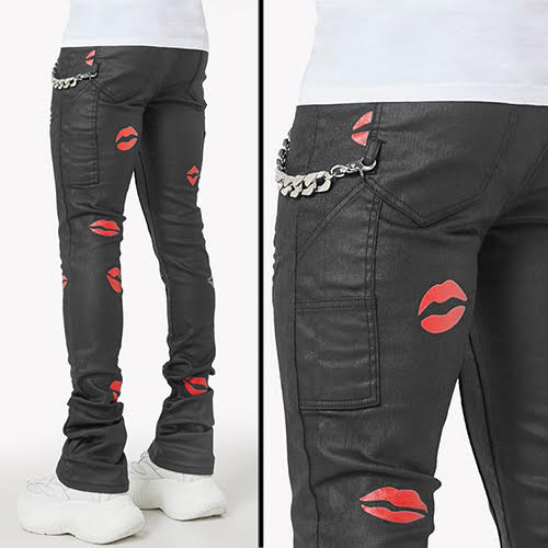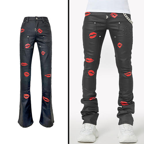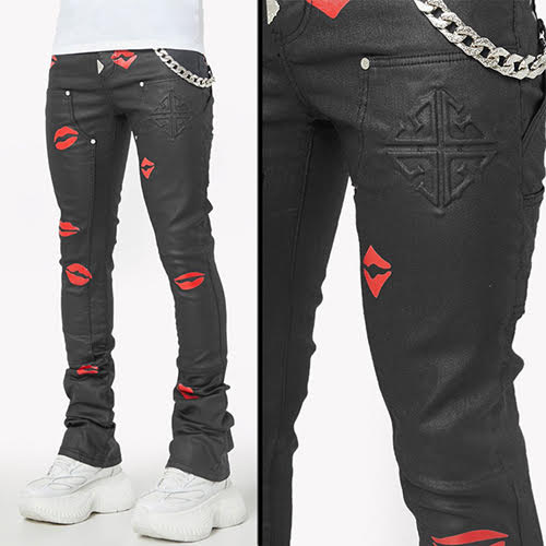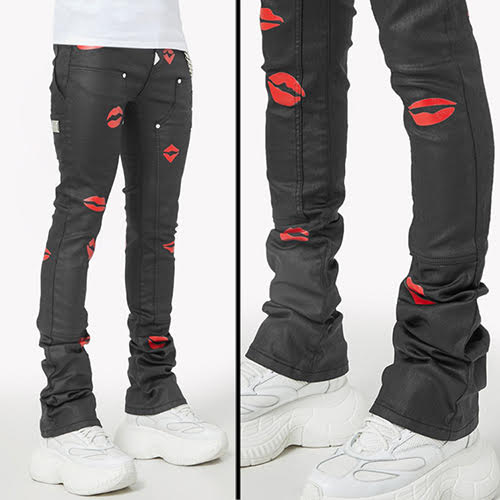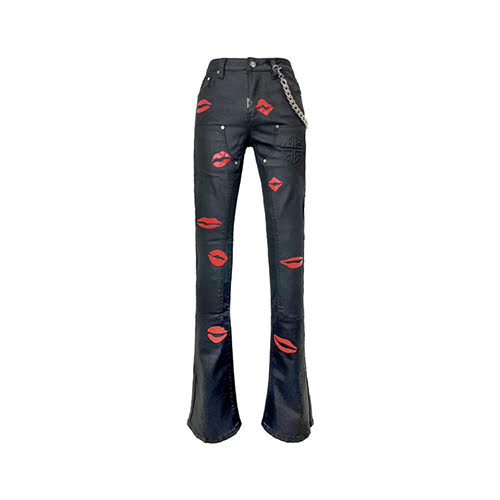 漆黒のワックスドデニムを使用し、光沢のある赤のキスプリントを散りばめた、反抗的でポップな一本。スタッキングシルエットがストリートスタイルのエッジを効かせ、