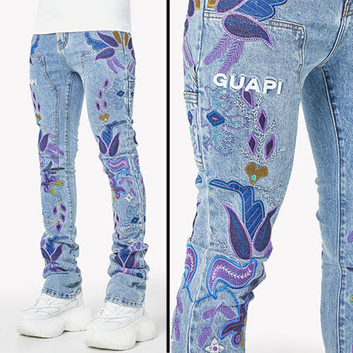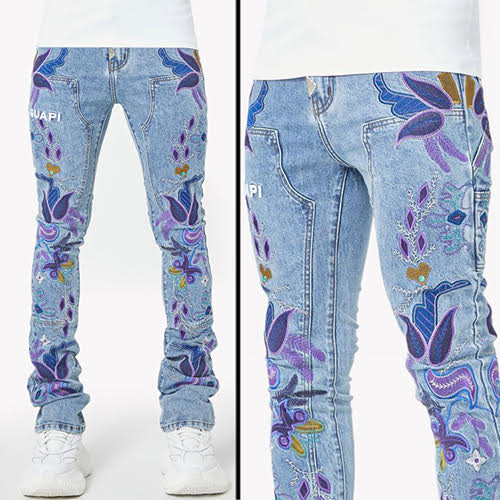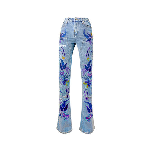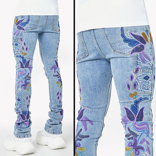 ライトウォッシュをベースにデザインされたこのジーンズは、リッチなパープル、ディープなブルー、そしてメタリックなアクセントを効かせた複雑なマルチカラー刺繍が特徴。