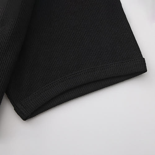 高品質なリブ編み素材を使用し、自然なストレッチ性と着心地の良さを保ちつつ、ボディラインを美しく引き締める構造を実現。