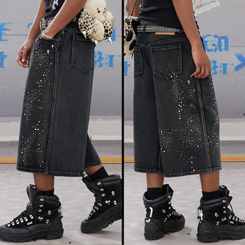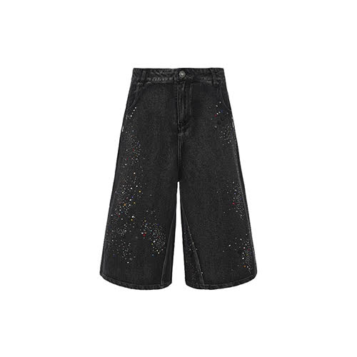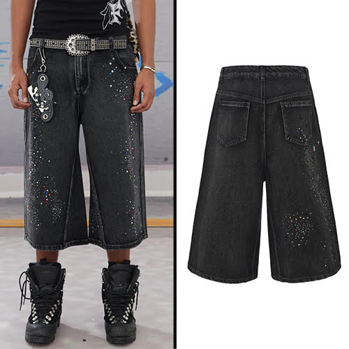 ダイヤモンドウォッシュド オーバーサイズ ショーツは、ダークデニムを再解釈し、ラインストーンの装飾と鮮やかなペイントスプラッターで星座のように散りばめ、