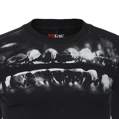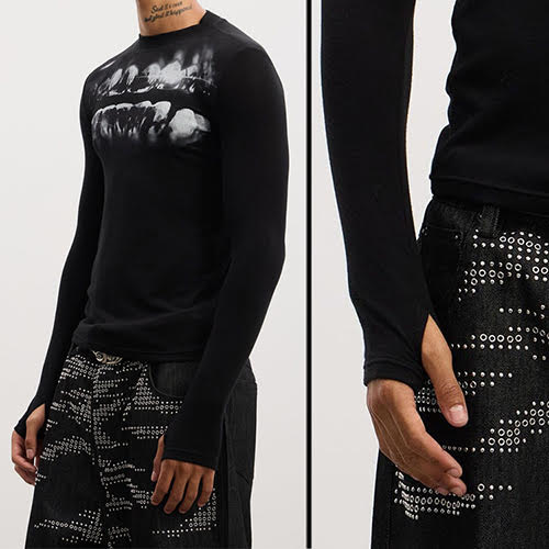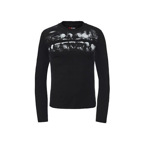 歪んだX線風グリルプリントが胸元を横切り、体にフィットするブラックシルエットと鮮烈な対比を成す。ミニマルなベースはクリーンなクルーネックラインと控えめなセンターバックシームで構成され、