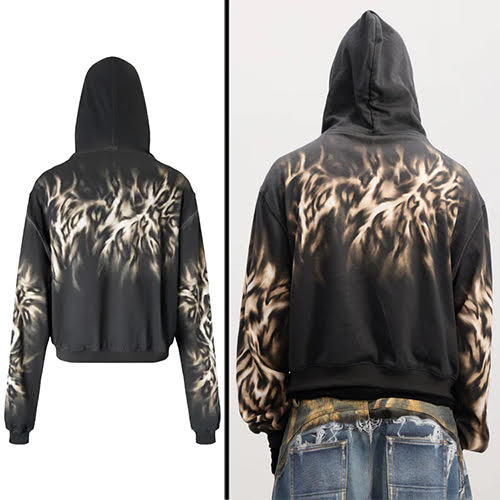 タイガー刺繍ジップアップフーディーは、切りっぱなしのエッジ感と大胆なグラフィック表現を融合させたデザイン。