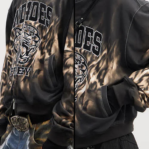 前面には刺繍の虎のグラフィックが配置され、カレッジスタイルのレタリングと組み合わさることで、強烈なストリートウェアの主張を放っています。