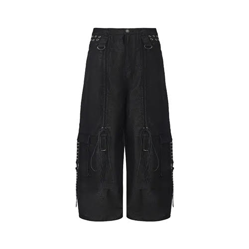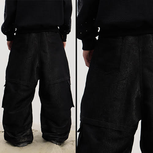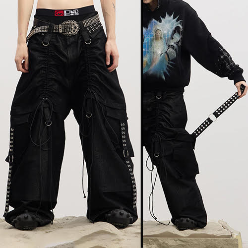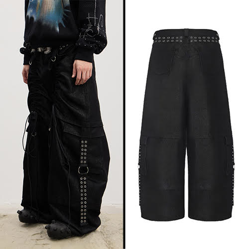 ドローストリング付きラッシェ加工パンツは、レイヤードディテールとオーバーサイズプロポーションで大胆な工業的エッジを体現。