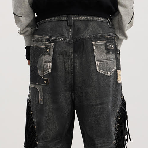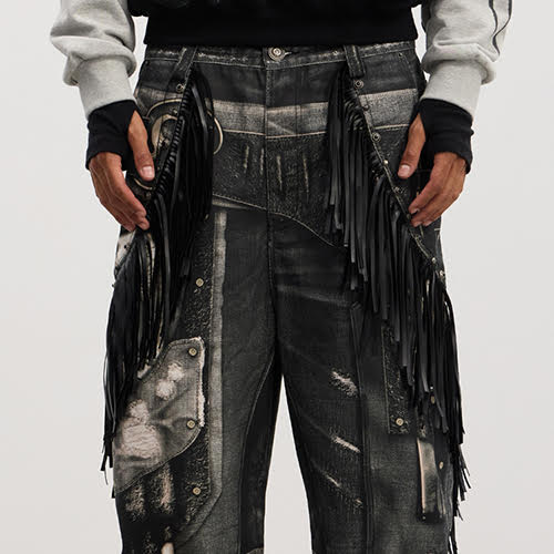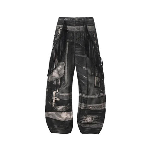フリンジ フルプリント バギー ジーンズは、主張のあるグラフィックと触感のエッジを融合。