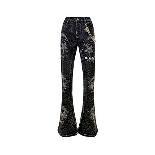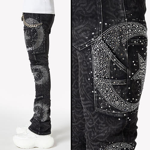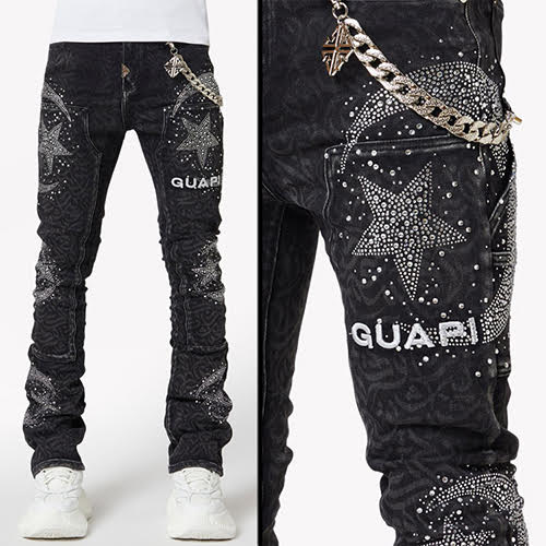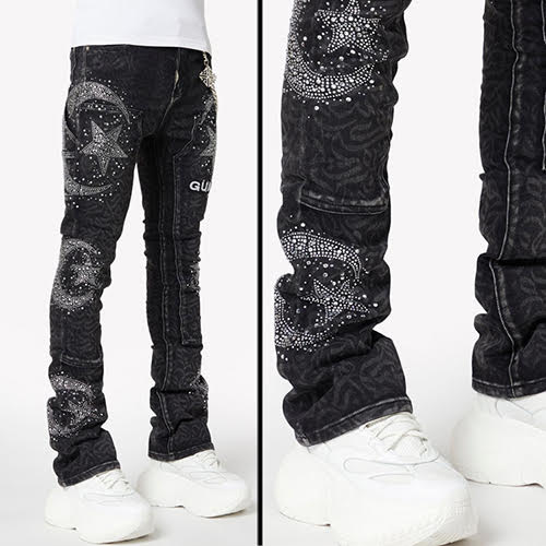 スタックフィットはシャープに仕立てられ、脚のラインを強調しつつストリート感覚の快適さを保持。シグネチャーのシルバー装飾がヒップから裾まで輝き、右太もも上部にはクリスタルラインストーンでGUAPIロゴが力強く配置。膝とふくらはぎ後部の立体パネルが構造的なアクセントを加え、デニム全体に宇宙的なモチーフを強調する。