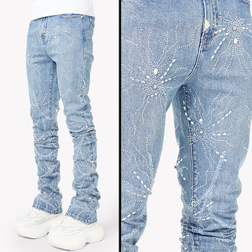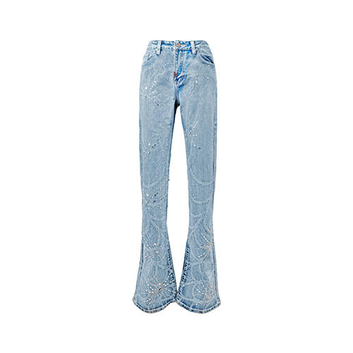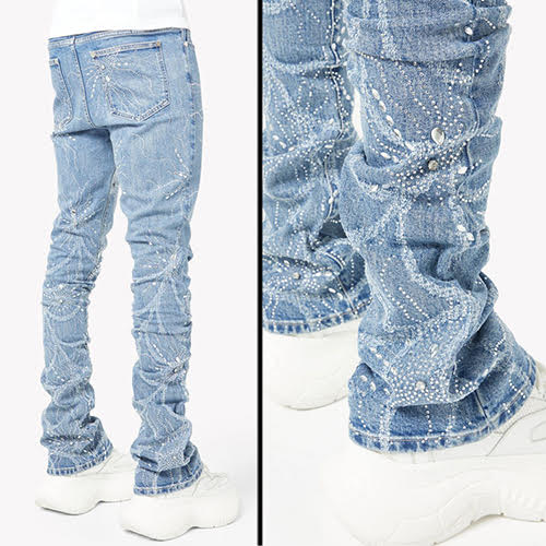 プレミアムなウォッシュ加工を施したスチールブルーデニムを裁断し、マイクロスタッド、クリスタルカットのラインストーン、涙型ジェムを用いた蜘蛛の巣をモチーフにした複雑な装飾を全体に施しました。