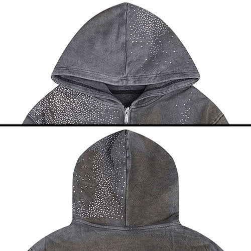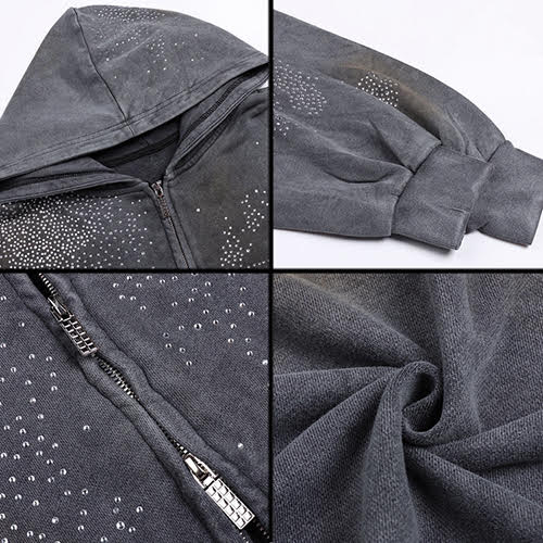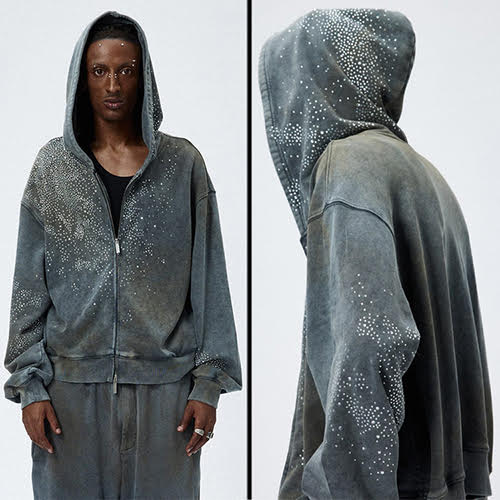 ダイヤモンド ディストレスド ジップアップ パーカーは、ヴィンテージの魅力とモダンなファッション要素を融合させた、豪華でスタイリッシュなアイテムです。