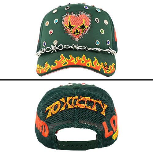 刺繍の炎のハートグラフィック、マルチカラーの宝石装飾、そして即座に熱気を帯びた印象を与える炎のステッチが施されたつばが特徴です。つばに施された銀色の有刺鉄線風チェーンがワイルドなデザインをさらに強調。メッシュバックが通気性と快適さを実現します。