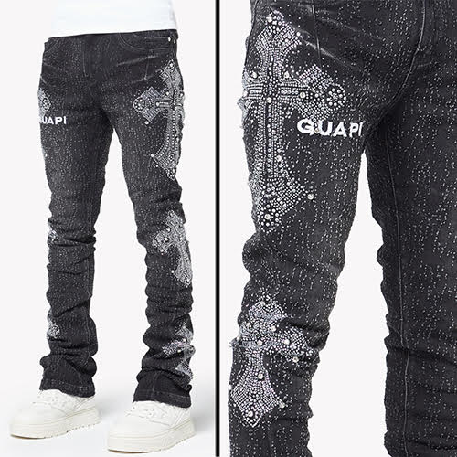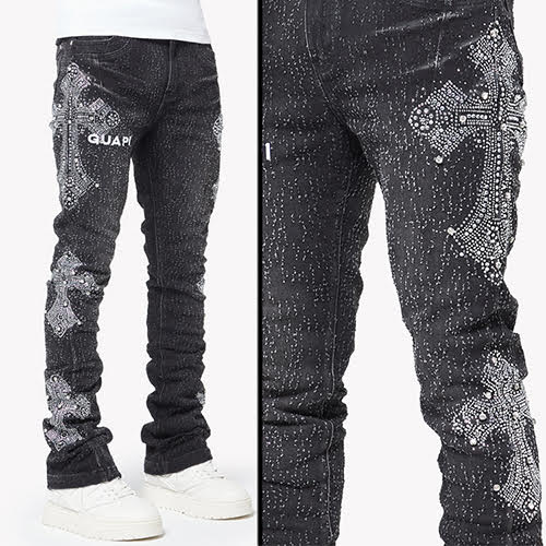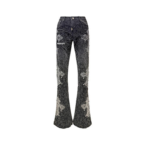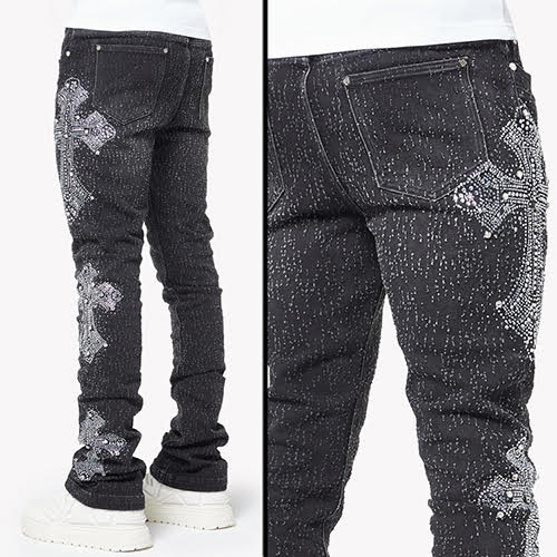 深いウォッシュドブラックのトーンで仕上げられたデニムには、雨滴のようなディストレスドパターンが施され、シルエット全体に動きと奥行きを加えています。最大の特徴は、太もも、膝、ふくらはぎに沿って配置された特大のクリスタルを散りばめたクロスモチーフ。