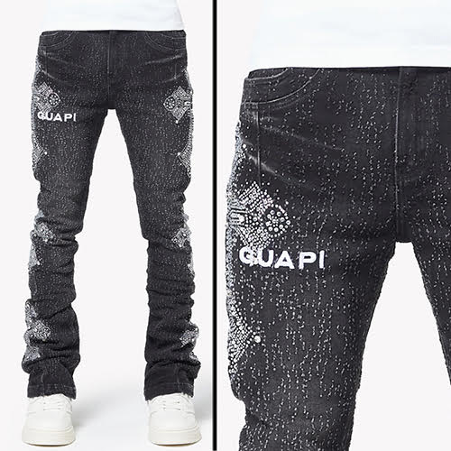 クリーンなミッドライズウエストとクラシックな5ポケット構造が基本を保ちつつ、太もも部分と裾に配されたGUAPIロゴがシャープなブランド感を添える。