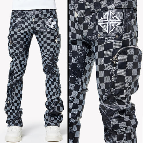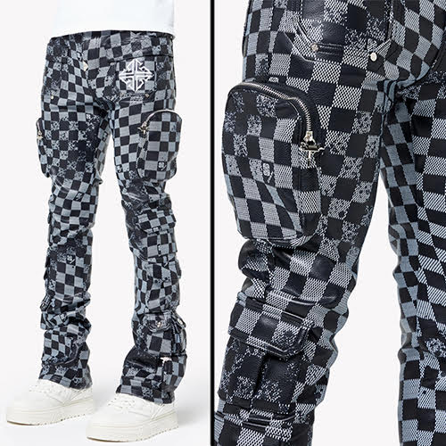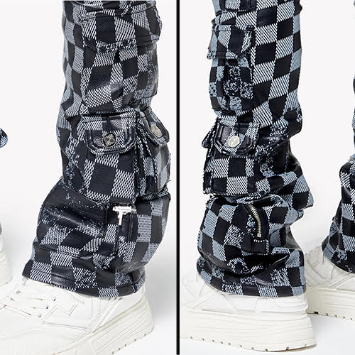 ストリートウェアのエンジニアリングとラグジュアリーな質感の大胆な融合、オブシディアンブラックのチェッカーボードレザーパンツは、GUAPIのシグネチャーであるカーゴスタックシルエットの境界を押し広げます。プレミアムなコーティング加工を施したレザー調生地で作られたこのパンツは、