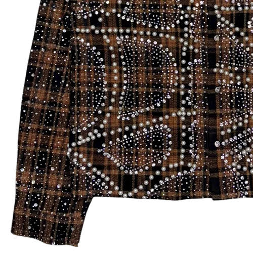 全体にチェック柄を施したデザインに、フロントと袖には繊細なスタッズ装飾を施し、質感と視覚的なインパクトを加えています。